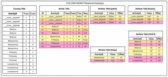 As this table lacks any temporal information, we need to introduce a novel table that preserves this. Each row in an states that the i-th event of the j-th trace () is labelled as , while q (or ) is the pointer to the immediately preceding (or following, ) event within the trace, if any. NULLs from Figure 3 in highlight the start (finish) event of each trace, where there is no possible reference to past (future) events. The primary index of the efficiently points to the first and last record associated with a given activity label in the time complexity. As the table’s records are sorted by the activity label, trace ID, and event ID by storing them as 64-bit integers, we can retrieve all records containing a given activity across the log. Pointers provide efficient access to the events immediately preceding and following a given event without additional access to the table and a subsequent join across accessed data.