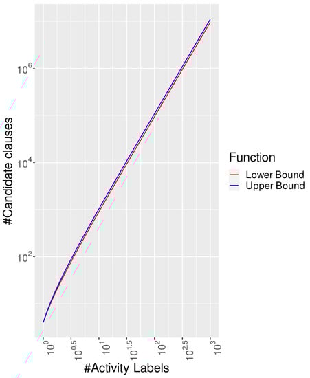 Figure 4 provides a clear picture concerning the impossibility of generating, testing, and returning all possible clauses for realistic datasets containing many distinct events through exhaustive search and propositionalisation within a reasonable amount of time. As an upper bound to the total number of possible clauses to be returned, we can consider instantiating all possible pairs of activity labels for the 11 binary clauses and instantiating the 4 unary clauses with (Absence) or (Exists), thus obtaining the following: