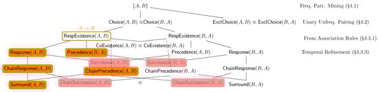 Our previous implementation of dataless declarative process mining, i.e., Bolt [], was designed to efficiently mine the twelve clauses listed in Table 1; however, it excluded the two newly introduced clauses, Succession and ChainSuccession, and our novel proposal introduced in the present paper, Surround (Section 3.2). Bolt outperforms all state-of-the-art dataless declarative mining competitors by leveraging KnoBAB’s aforementioned indexed tables while avoiding costly formal verification computations by only detecting vacuity and violation conditions without the need for combining multiple xtLTLf operators, as they can generate considerable overhead due to the intermediate results being generated by the implementation of the relational operators. Moreover, declarative clauses are generated using a general-to-specific search, starting from frequent clauses being directly inferable from association rule mining, such as RespExistence and CoExistence, temporally refining them by starting the visit of the lattice in Figure 5. To avoid generating uninteresting atemporal behaviour when temporal behaviour might be identified, we generate Choice and ExclChoice clauses by combining unary infrequent patterns. Our current solution further improves this by discarding the return of such clauses if any more informative temporal behaviour is returned (Section 4.3.5).