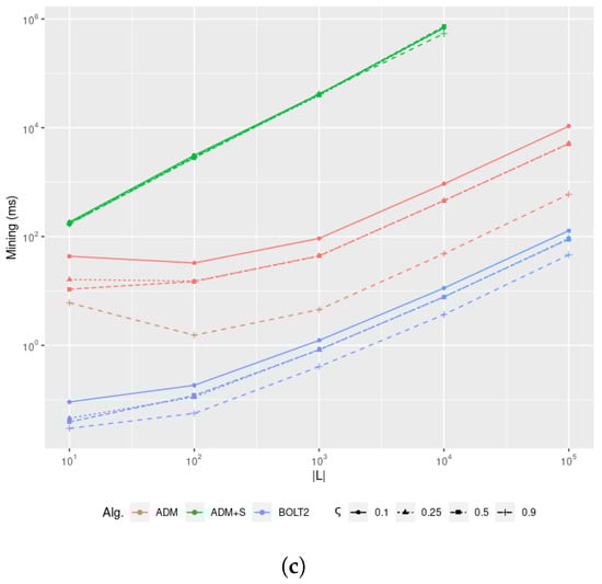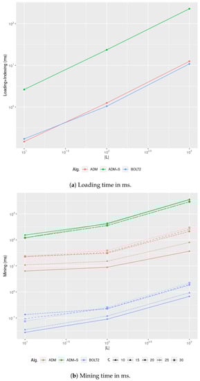 We focus our attention on two frequent itemset mining algorithms. The Apriori [] is a brute-force mining algorithm that begins by calculating an table, which associates each item in I with its support, denoted as . For each i-th iteration step from 1 to , the algorithm prunes each frequent itemset table containing all of the itemsets of length i using a minimum-support threshold . If is not empty, we might compute the itemsets of length as . In the worst-case scenario, this algorithm runs in exponential time: . FP-Growth [] improves the time complexity of the former algorithm by merging the itemset generation phase with the itemset pruning via the minimum support threshold, considerably reducing the overall time complexity. This enhancement exploits an item support table and the representation of frequent patterns as a prefix tree. The latter guarantees a compact in-memory representation of the transactions, and offers an efficient general-to-specific approach when generating frequent candidate itemsets.