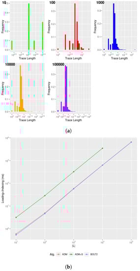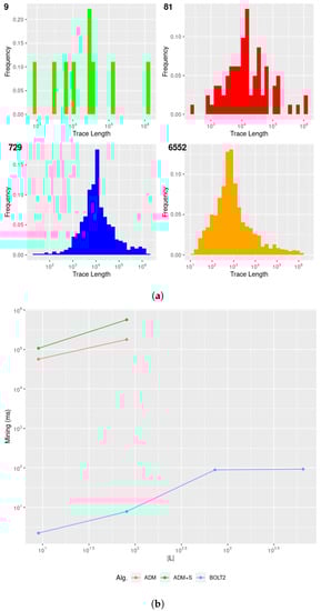 The wide adoption of such techniques makes finding efficient algorithms for solving specification mining tasks more pressing. Relational databases, usually providing more efficient query plans than other NoSQL representations [], provide suitable representations for storing and querying collections of temporal information, thus including numerical time series [], temporal updates of entities, and relationships represented in the relational model [], as well as recording multiple traces as logs. In particular, traces result from observing a completed real-world process, providing a temporally ordered sequence of activities being audited [,]. Recent research shows how temporal data can always be represented as traces, as time series segmentations discretise multi-varied time series into discrete, fully observable, linear, and distinct events, identifying the different states in which a system is transiting [], as well as the variations (increases or decreases) of the values associated with time series []. Such a segmentation also allows to optimise pattern searches over temporal processes []. In the context of temporal data, long-time proposed declarative languages provide both human-readable representations for temporal behaviours as clauses/templates [] as well as suitable query languages for expressing formal verification tasks [,]. Adopting such languages is extremely beneficial for specification mining tasks, as they fairly restrict the sets of all possible temporal behaviours to certain interesting patterns of interest, thus allowing a restriction of the space search.