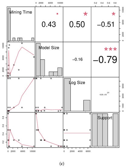 Specification mining over logs stipulates the return of temporal behaviour fulfilled by most traces in a log; such a majority constraint is usually assessed through a minimum support threshold . This allows the practitioner to impose early stopping conditions to avoid testing underrepresented temporal behaviour. Despite the adoption of such a constraint, state-of-the-art specification mining algorithms [,] still test all the traces in the log without using the minimum support threshold as an earlier stopping condition (Section 3.3 and Section 6.3), thus introducing sensible overhead while testing unnecessary temporal behaviour. This is a desired feature when dealing with real data. Furthermore, the aforementioned approaches are hindered by the exhaustive generation and testing of declarative clauses instantiated over each frequently occurring event type [,], thus being heavily hindered by the curse of propositionalisation. As a result, existing approaches do not adequately scale up to the size of big and real-world datasets, as the running time becomes quite explosive in the long run (Section 5.3). As the adoption of a declarative language to express the temporal behaviour of interest considerably reduces the space search for the temporal behaviour to be returned as a specification, we can efficiently visit our search space by organising the candidate’s temporal behaviour to be tested as a lattice (Section 2.2 and Section 4.3), where the descent is pruned using the aforementioned as an early stopping condition. As a consequence of the missed opportunity to exploit faster search approaches, current algorithms do not ensure the provision of specifications of compact sizes. This feature is essential due to the profusion of mined declarative clauses which are later utilized as features to describe temporal data sequences in learning tasks [] (Section 2.1). Such an approach can easily lead to trained models that overfit the training dataset [], while training data with such an explosive amount of features requires an exponential number of data samples with respect to the number of such features (https://youtu.be/QZ0DtNFdDko, accessed on 10 September 2023).
