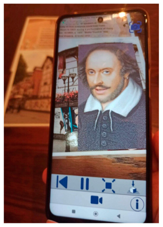 The game begins with the players being welcomed at the classroom door by their teacher, who gives each one of them a ticket for an imaginative guided tour for the Globe Theatre in London. Players have to speak in English and use the information printed on their tickets (e.g., the time of the guided tour, the meeting place, the name of the tour guide) in order to find the rest of the group members and to form their team. The game is designed to accommodate two teams of four to five members each. They meet at different classroom spots; they use their mobile devices to scan the tickets in order to access the first augmentation, which consists of an auditory extract. It is the voice of their prospective tour guide informing them that Shakespeare’s ghost has locked them in the Globe Theatre, but luckily there is a spare key somewhere in the theatre. The tour guide sets the mission of the game, which is to find the missing key. S/he concludes by saying that the answers are in the students’ hands, thus encouraging them to take further action with whatever they hold in their hands, i.e., their ticket and their mobile devices. There follows a variety of AR clues and messages, which will guide learners to different classroom areas in order for them to find the next clue, which will bring them closer to escaping. During their mission, players must read (Figure 3), listen (Figure 4), keep notes and decode messages, as well as work quickly and cooperatively, while using their critical thinking skills, if they want to stand a chance of finding the hidden key and escaping from the Globe Theatre.