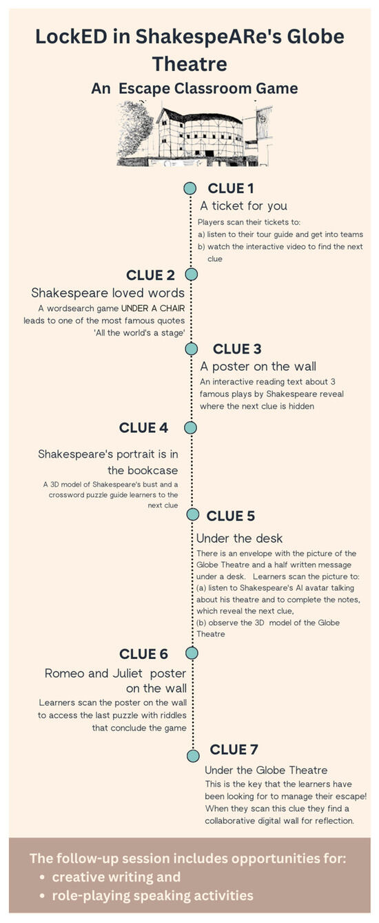 Each clue introduces different content and cultural elements of the life and work of Shakespeare and, at the same time, it provides opportunities for practicing language skills in English. The classroom should be divided into two sections and the players should be informed of their designated playing area. Both teams receive the same clues and messages, which they look for in that specific classroom space. One clue leads them carefully to the next one and there is no danger of overriding from one to the other. In particular, ‘LockED in ShakespeARe’s Globe Theatre’ follows a sequential organization method [60], because game participants are asked to solve one puzzle at a time, the answer of which will reveal the following clue in the sequence, until they reach the final puzzle and find the key that they had been looking for in order to manage their escape and win the game (Figure 5).