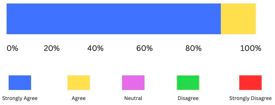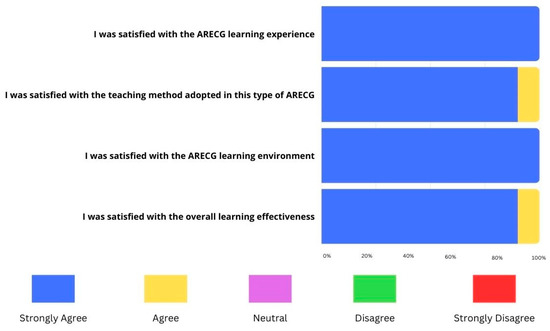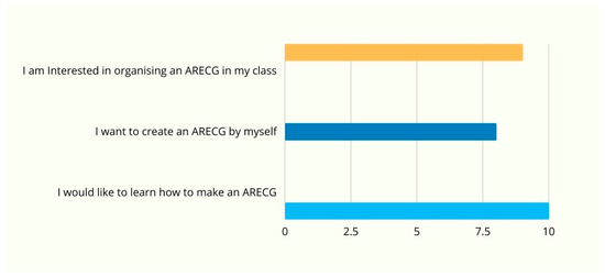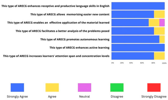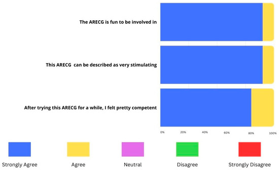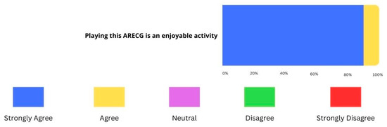 The teachers’ perceptions towards the ARECG were very positive. The first construct (C1) explored the level of enjoyment felt by the participants when involved in the ARECG. The majority of teachers (90%) strongly agreed that it was an enjoyable activity, a result that can be attributed to the pleasant and playful AR environment (Figure 13).