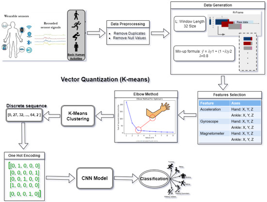 The limited availability of sensor data and the complexity of human activities pose serious challenges in developing reliable and accurate HAR models. In HAR, problems arise when trying to solve overfitting and function representation issues. However, these challenges also bring opportunities for innovation. By using techniques such as semi-supervised learning and higher-order data representation like vector quantization, we can resolve data gaps and improve model interpretation. Next, we convert these data into simpler, discrete representations using vector quantization via K-means. For the value of k in K-means, we use the elbow method to determine the optimal number of clusters for each class in the dataset. Then, we convert the discrete sequences into one-hot encoded vectors to pass them to the model. Finally, we pass this vector to the CNN model, ensuring precise recognition of human activities. Figure 1 illustrates the entire framework. Details of each step are discussed below.