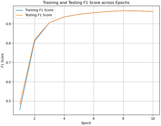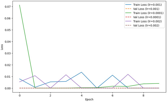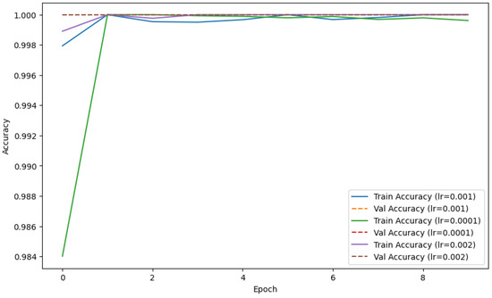 We tested the WISDM dataset with different learning rates, but the F1 score stayed at 100% every time. This is because the dataset contains clean and well-labeled sensor data from both smartphones and smartwatches collected from 51 subjects performing 18 different activities. The activities are distinct and varied, making it easy for models to recognize patterns. Additionally, the sliding window technique used to process the time-series data helps improve model performance. Previous research has also shown similar high accuracy with this dataset [36,37]. Figure 8 and Figure 9 depict curves that were generated to check the impact of learning rates on the accuracy and loss of the model.