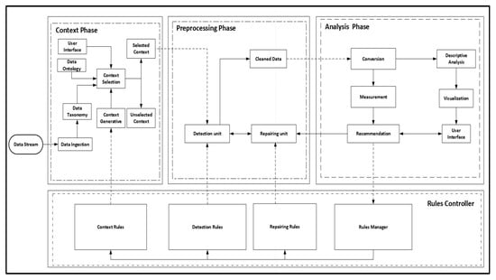 The proposed streaming data cleaning framework, as shown in Figure 1, consists of four sections, namely the context phase, preprocessing phase, analysis phase, and rules controller.