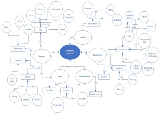 This phase incorporates several steps to deal with incoming data that come from various sources. The first step in this phase is data ingestion, the goal of which is to gather data and move it to a target, which makes it easier to capture useful information in the streaming data. When the streaming data are ingested, using Apache Kafka, a data taxonomy is created to classify the streaming data, as shown in Table 3, since the data in the stream are not classified. After classifying the data in the stream, we use Protégé to build a data ontology to link the data together. Figure 2 presents a healthcare data ontology in the streaming data.