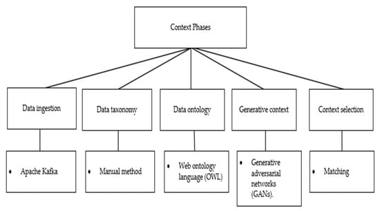 The context selection unit maps the data taxonomy into the data ontology and then the context is selected based on the user’s selection via the user interface. The data classification helps to provide a recommended context to the user interface for selection in the streaming data, based on the user selection. For example, the user starts by selecting a domain such as healthcare, industry, banking, etc. Then, the category is displayed to the user, as shown in Table 3, namely Person, Equipment, Environment, Place, and Services, each category having a different subcategory. After this, the subcategories are provided for the selected category; for instance, if the user selects Person as the category, the subcategories are information, condition, role, and activities. If the user selects the category Equipment, the subcategories are equipment information and equipment condition. Thus, the system provides the context to the user based on the user’s selection in the previous section. Further clarification is given in Section 4.1. Generative adversarial networks are applied to generate context in streaming data. The context generative unit automatically amends the context by adding or removing context from the streaming data based on the context rules unit from the rules controller. The rules controller is explained in the following subsections. The context is passed to the preprocessing phase. Figure 3 shows the possible techniques that can be used for each unit in the context phase.