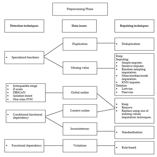 Data preprocessing consists of two stages, namely data issue detection and data repair. Data issue detection techniques are methods that are used to check if the data contain issues or not, while the data repair technique is used to fix the issues detected in the data. Thus, we divide this section into detection and repair techniques.