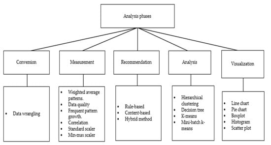 The analysis phase comprises several components, namely conversion, measurement, recommendation, descriptive analysis, and visualization. The conversion unit transforms the format of the streaming data to a usable format using the data wrangling technique. The measurement unit comprises several techniques that are applied to the context, such as data quality measurement, min-max normalization, and weighted average patterns technique. The weighted average patterns technique captures any change in the data stream patterns. The normalization techniques are useful for classification and clustering []. The result of the measurement unit passes to the descriptive analysis unit and the recommendation unit. The descriptive analysis unit analyzes the context and there are several techniques that can be used such as k-means clustering and decision tree. Then, the visualization unit visualizes the result of the descriptive analysis to the user using charts such as line charts or pie charts. The recommendation unit recommends a cleaning data method to the user based on a comparison of the performance of each cleaning technique using the rules-based approach and recommends the best technique in terms of performance to the user. This comparison is repeated if the streaming data patterns change. The user makes a decision whether to apply the recommended cleaning technique or not based on analytics visualization and data quality measurement. Figure 5 shows the different approaches that are used in the analysis phase.