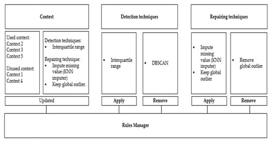 The rules controller connects all the different phases and comprises four units, namely context rules, detection rules, repairing rules, and rules manager. The rules manager keeps the dynamics of the proposed framework by amending the other rules units based on the outcome of the recommendation unit and user selection from the analysis phase. The purpose of the context rules unit is to update the context generative unit with current preprocessing techniques and current context, so it is connected to the context generative unit to add or remove context from the selected context unit in the context phase. The detection rules unit applies and removes detection rules from the detection unit in the preprocessing phase based on the analysis phase result and user selection. Similar to the detection rules, the repairing rules unit keeps adding and deleting the repairing rules from the repairing unit in the preprocessing phase. Figure 6 shows an example of the rules controller.