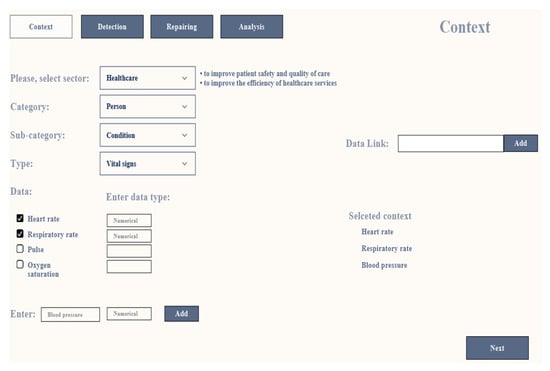 The expert starts by selecting healthcare as a domain from the context screen. Improving patient safety, healthcare services, and quality of care are the benefits that the expert expects when selecting the healthcare domain as a sector. The expert continues selecting a person as a category, then selects a condition as a sub-category of the person, and finally, vital signs as a type of the condition. Then, the vital signs automatically appear on the screen and the expert selects the heart rate (HR), the mean blood pressure (NBP (Mean)), and the breathing rate (RR) to be monitored and provides the data link because sensors are used to collect data during surgery. When the context is ready and the data link is provided, the expert presses the next button to move to the next screen, as shown in Figure 7.