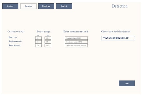 In the detection screen, the user sees the selected context from the context screen as the current context. Then the user determines the range of the data if the data type is numerical, which helps detect the outliers. The reason why the user defines the range of data values is that the range varies based on different factors, which is obvious to the user. The user needs to set the measurement unit of the context that has been selected to unify the measurement as it assists in detecting errors in the streaming data if they occur. Finally, the user defines the date and time format that is followed during the detection process if a different format appears. This screen is connected to the detection rules unit in the rules controller. Other issues, such as duplication and missing values, do not need any setup from the user side because there is only one approach to detect these issues. When the detection rules are finalized, the user clicks the next button to move to the repairing screen. The detection rules are sent to the detection unit in the preprocessing phase that is set by the user and other default detection rules (i.e., duplication, missing value issues). Figure 8 shows the detection screen.