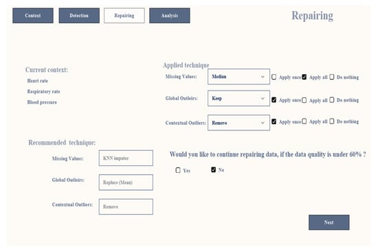 The user sets the repairing techniques to fix any issues that appear in the context and presses the next button to navigate to the analysis screen. The repairing unit in the preprocessing phase receives these repair rules in two ways. If the user applies the recommendation technique, the repairing techniques are sent from the recommendation unit in the analysis phase and the repairing rules in the rules controller are updated. If the user chooses to apply a different technique to what the system recommends, the repairing rules are sent from the repairing rules to the repairing unit in the preprocessing phase. Figure 9 presents the repairing screen.