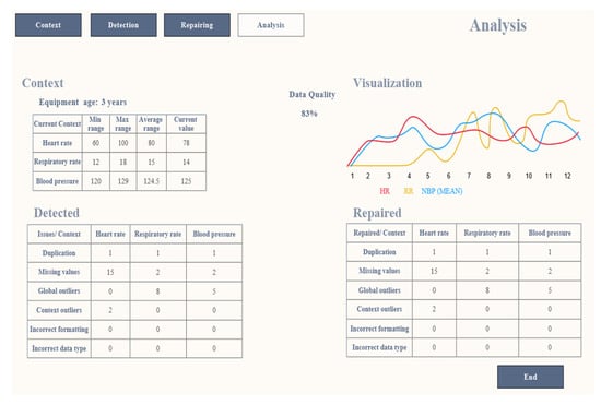 The analysis screen presents to the expert a summary table of the currently selected context, a summary of the detected issues and repairing issues, and the chart with the data quality percentage of the stream data. The detection unit captures issues regarding the values of the HR, RR, and NBP (Mean) and the number of the detected issues for each issue is presented in the detection table to the expert. These issues pass to the repair unit and the selected techniques are applied to repair these issues. The repairing table shows the number of repaired data for each issue, as shown in Figure 10. The expert noted from the detection table that the selected context contains missing values, and the RR has eight global outliers because the breathing device was not used at the beginning (the RR values were 0 breaths per minute and the lower limit for RR was 12 breaths per minute); however, the breathing rate is now in the normal range, so the expert ignores the outliers in the RR. The expert sees any detection issues that appear in the detected table. The repair table shows the number of repaired issues to the expert, so the expert has insight into the functionality of the system in terms of detecting issues and repairing the issues in the streaming data based on the selected cleaning techniques.