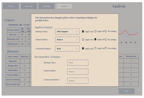 The reason for using average data quality is that repairing data is based on assumptions, especially imputing missing values or replacing outliers. Therefore, the data quality percentage and the charts can assist the user in making better decisions in real time. If the data pattern in the stream data has changed, a popup window appears on the analysis screen that asks the user to select the repair techniques based on the current situation. Finally, the user clicks on a button to end the session. Figure 10 shows the analysis screen and Figure 11 shows the popup window.