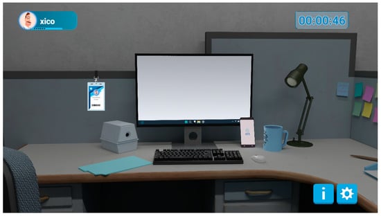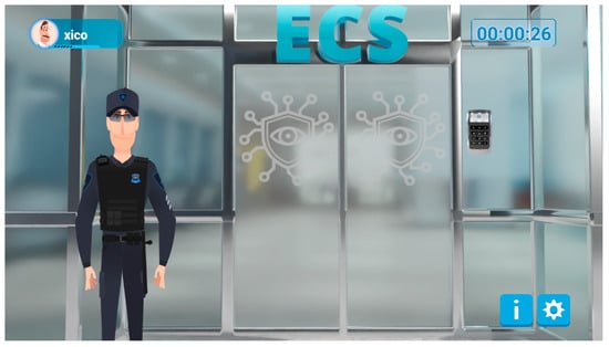 Episode 1—The Test: The first episode begins with the selection of an avatar and a name. To enter their new workplace, the player must enter an access code. They receive their first clue from the security guard at the door (Figure 1). The player must combine the letters used for the name of the bank, ECS (work place), with the alphabet to obtain the code with which they can enter the bank. This task gives some notions about the cryptographic process. After entering the bank, the player must set up their email account using their first password. Hints are provided around the desk and once the correct password has been used, the player can then select a new password. The player is asked whether the password should be saved on a computer and whether the anti-virus software should be switched off. The answer given then leads to further clues as to how the game could continue. The next task is to check certain emails to see whether they are possible phishing e-mails or not. The player can read and accept the emails as legitimate emails or reveal them as phishing e-mails. If the player identifies all e-mails correctly as legitimate or phishing e-mails, they will remain part of the game. If the player makes mistakes with the allocation of e-mails, they lose time, which might make it difficult to complete the EER. The episode ends with a summary of the topics learnt.