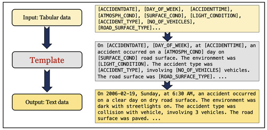 To get coherent, informative passages enriched with domain-specific knowledge, we use a simple yet effective template to convert the raw structured tabular data into detailed, human-readable textual narratives, encapsulating vital information about traffic accidents, which can be better consumed by LLMs. This process is depicted in Figure 1.