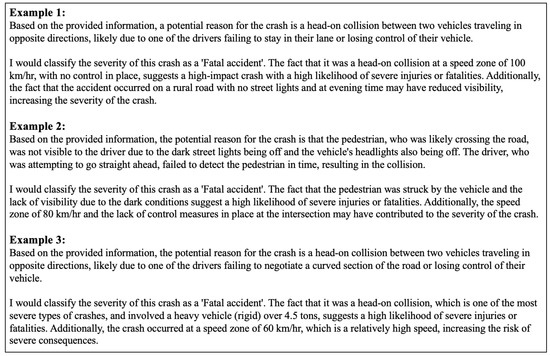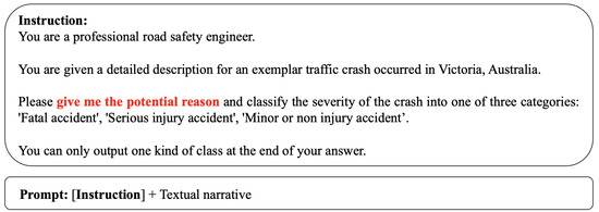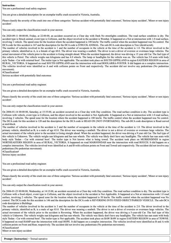 However, in practice, it is difficult to obtain sufficient high-quality explanation examples for crash severity classification, while low-quality explanations can harm the CoT performance. Therefore, following strategies in [19], we simply ask LLMs to think step by step to conduct traffic safety analysis and inference. Some template examples are presented in the Section 4. Besides allowing for a more transparent and understandable interaction with LLMs, the CoT approach is also practically useful in several key aspects: (1) Reducing Errors in Crash Risk Assessment: By breaking down complex traffic scenarios, CoT can better understand and reason over specific cases, thus reducing errors in crash risk analysis [14,20,21]. (2) Providing Adjustable Intermediate Steps for Crash Analysis: CoT enables the outlining of traceable intermediate steps within the crash analysis process. This can be helpful in identifying potential biases or errors in the model’s reasoning and allow for more reliable crash risk assessment [22]. By leveraging the CoT approach in traffic safety analysis, we can enhance the interpretability and reliability of crash risk assessment.