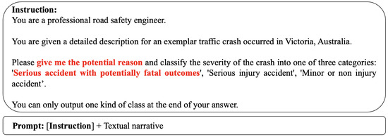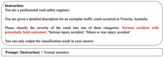 The prompt designed for zero-shot with prompt engineering setting is demonstrated in Figure 4. The provided prompt instructs LLM to serve as a professional road safety engineer to classify the severity outcome of a traffic crash, using a descriptively modified set of categories (see the revised class description in red in Figure 4). to accommodate alignment constraints in LLMs. The engineer must categorize the crash into one of three revised descriptive labels: ’Serious accident with potentially fatal outcomes’, ’Serious injury accident’, or ’Minor or non-injury accident’. The prompt explicitly requires the engineer to output only the classification result.
