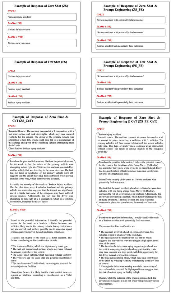 In the plain Zero-shot and Few-shot settings, the models respond directly with one of the three class labels, i.e., “Minor or non-injury accident”, “Serious injury accident”, or “Fatal accident”. Similarly, in the ZS_PE and FS_PE settings, the models respond directly as “Minor or non-injury accident”, “Serious injury accident”, or “Serious accident with potentially fatal outcomes”.