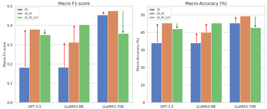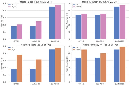 Figure 8 demonstrated the performance gains by CoT and PE as compared to the plain zero-shot setting. Both ZS_CoT and ZS_PE consistently demonstrate enhanced performance in terms of Macro F1-score and Macro-accuracy across all three models evaluated. This improvement underscores the efficacy of CoT and PE in boosting model performance in zero-shot scenarios.