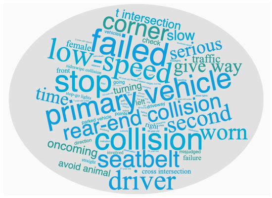 The word cloud for “Minor or non-injury” accidents (Figure 10), is characterized by distinct terms suggesting lower impact and preventative measures, such as “Low speed” and “slow”, indicating the LLM associates lower velocities with less severe outcomes. “Seatbelt” and “failed” suggest a focus on minor infractions and safety equipment. “Stop” and “time” may relate to issues at intersections or reaction times. “Rear-end collision”, and “corner” also are prominent, indicating that LLM associates rear-end collision or accident impact on corners of vehicles with less severe outcomes.