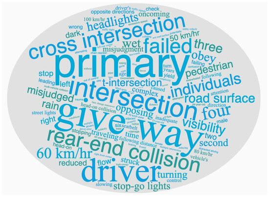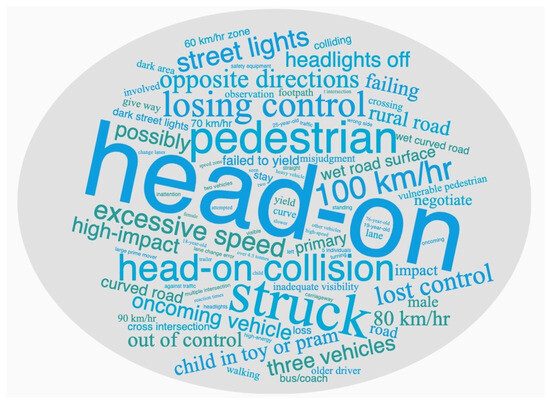 The word cloud for “Serious injury accident”, shown in Figure 11, is characterized by terms suggesting moderate impact, such as those relating to drivers (e.g., “give way”, “misjudged”) and locations (e.g., “intersection”, “cross intersection”). “Wet”, “rain”, and “visibility” emerge, highlighting adverse weather or environmental conditions. “60 km/h” and “50 km/h” reveals relatively high speeds are associated with more severe outcomes. “Four” and “three” appear, indicating potentially more vehicles or individuals involved in an accident with severe outcomes. “Rear-end collision” appears again, which combines with “intersections” and the higher speeds (e.g., “60 km/h”), could lead to “Serious injury” accidents.
