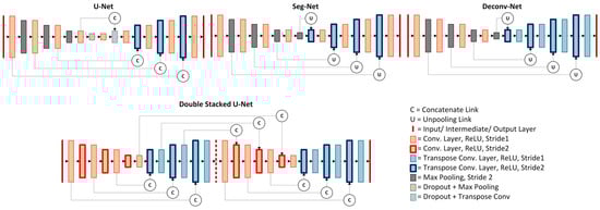 There are many variants of CNN based on the convolution types and the layer depth of the network. This research used four CNN models (see Figure 1) to train using the above dataset. The first model is derived from U-Net and was initially used for classification or segmentation [23]. The slightly modified U-Net retains convolutional, max pooling, and transpose convolution layers with Rectified Linear Unit (ReLU) activation and skips connection (concatenation layers); the only difference is the use of regression layer to facilitate the denoising/image regression process. The second CNN is a Double U-Net which stacked two modified U-Nets; the modification involves the use of a convolution layer on stride two as the contraction layer, using transpose convolution layers for the whole expansion layer, adding skips connection between two U-Nets and using the regression layer at the end for denoising process [5].