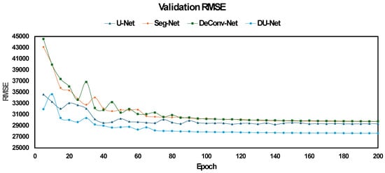 The validation RMSE shown in Figure 3 indicates almost the exact figure between Seg-Net and DeConv-Net at 29,743.56 and 29,771.56. The U-Net performance is a bit better than the previous two at 29,222.38, which occurred at 140 epochs, and Double U-Net reached the peak of performance at 27,638.64. Besides the U-Net, the other three have a minimum RMSE at the epoch ends.