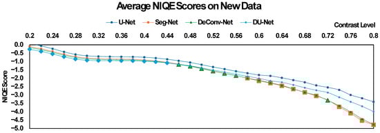 The new testing followed the same procedure: finding the NIQE average scores on patch [16 × 16] and 31 contrast levels (from 0.2 to 0.8 with a factor of 0.02) and determining which contrast has the highest improvement score on DU-Net. It was followed by a qualitative analysis involving the number of improved images and the number of images in which DU-Net came out at the top.