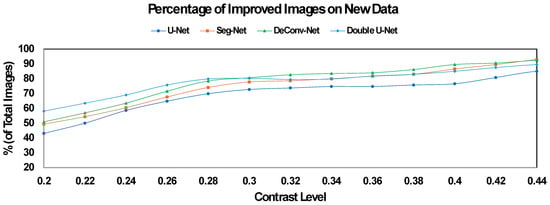 Rather than using the number of images, the percentage of improved images and the number of images with the best scores on DU-Net represent a percentage of the total images. Figure 4 shows the percentage of enhanced images on four CNN models, and they show almost similar trends; the data indicate a rapid ascend in percentage from a contrast level of 0.2 to 0.34, then a steady increase until 0.74 before changing to a gradual descent—a slight percentage variation between CNN models in the contrast level above 0.36.