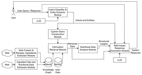 The final output is presented to the user as the System Response. To maintain up-to-date knowledge, the system includes a Web Crawler and Recipes & Ingredients Extraction Module that continuously gathers new recipe data, while the Ingredient Diet and Nutritional Data Extraction Module is used to enrich the KG with reliable dietary and nutritional information.