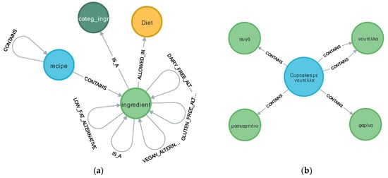(a) The recipe’s Neo4j KG schema. (b) Example subgraph showing a recipe node Cupcakes with Nutella (Cupcakes με νουτέλλα) connected to its ingredients, i.e. eggs (αυγά), Nutella (νουτέλλα), self-rising flour (φαρίνα) and mascarpone (μασκαρπόνε), via CONTAINS relationships. Greek terms in parentheses reflect the original labels in the KG.