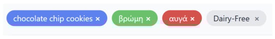 The semantic annotation of the extracted values is validated and mapped against the entities defined in the KG, ensuring alignment with its schema. Each recognized entity is associated with a corresponding semantic category present in the graph (e.g., chicken: ingredient, vegan: diet, moussaka: dish, breakfast: course), which defines its functional role in the query structure. This mapping step enhances semantic consistency with the KG structure and contributes to accurate query construction.