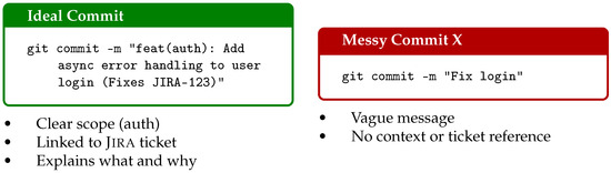 As shown in Figure 1, the ideal message encodes both the purpose and the rationale of the change, often including an issue/ticket identifier, whereas the messy example omits key context. In our study, this rubric is operationalized in the annotation guide used for human ratings and in lightweight heuristics (e.g., presence of imperative verb, token length window, and optional ticket/issue reference) to aid qualitative analysis.