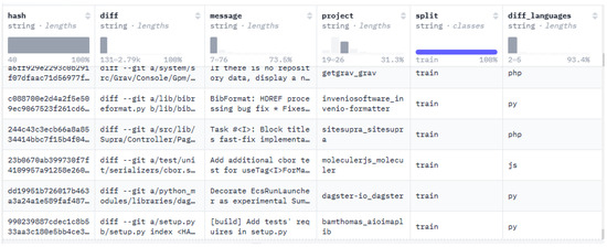 - Schall, M.; Czinczoll, T.; De Melo, G. Commitbench: A benchmark for commit message generation. In Proceedings of the 2024 IEEE International Conference on Software Analysis, Evolution and Reengineering (SANER), Rovaniemi, Finland, 12–15 March 2024; IEEE: Piscataway, NJ, USA, 2024; pp. 728–739. [Google Scholar]