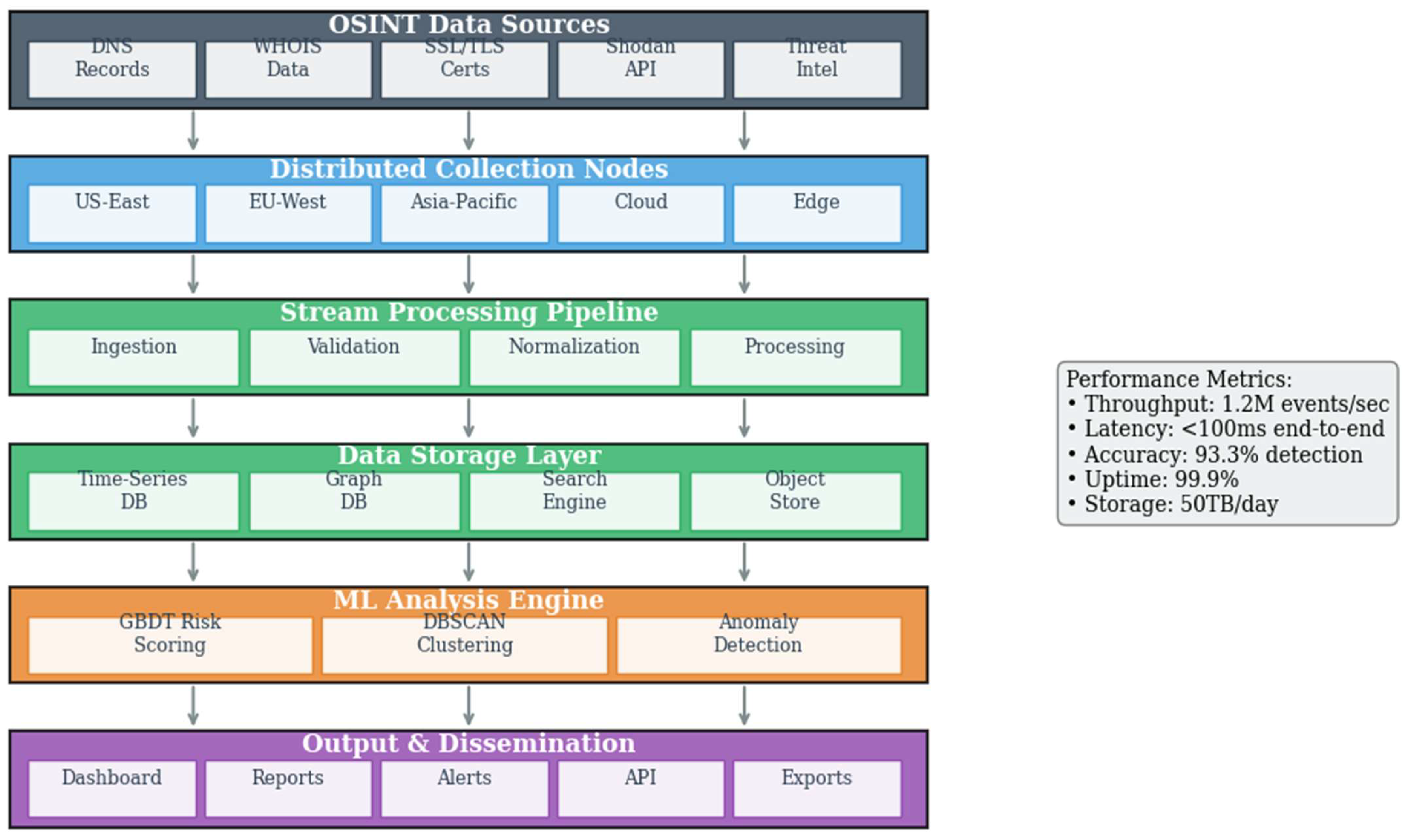 15] highlighted data quality inconsistencies as a primary challenge in OSINT methodologies, which our preprocessing pipeline addresses through sophisticated normalization and validation mechanisms. The system resolves the scalability constraints documented by Pastor-Galindo et al. [