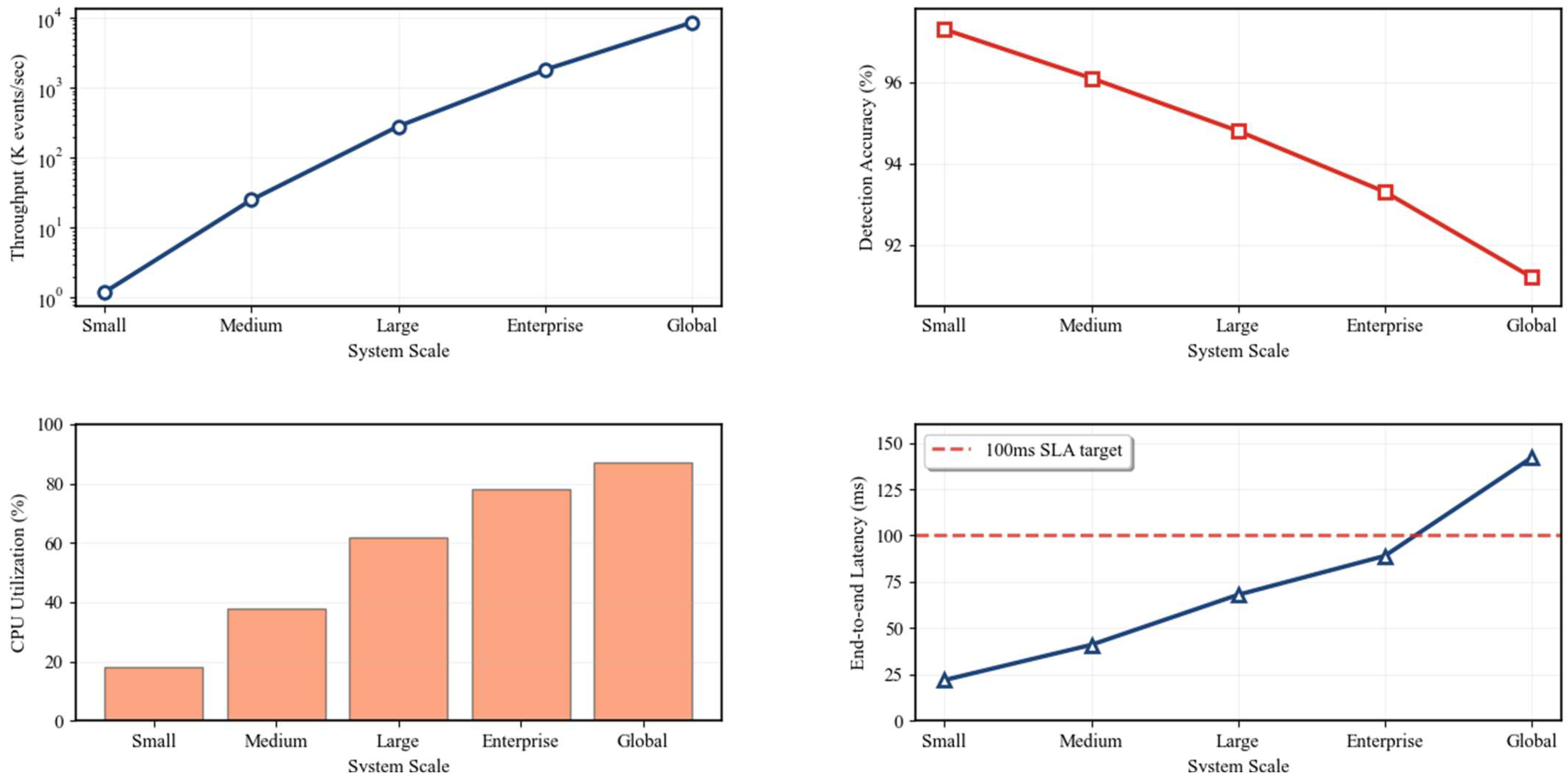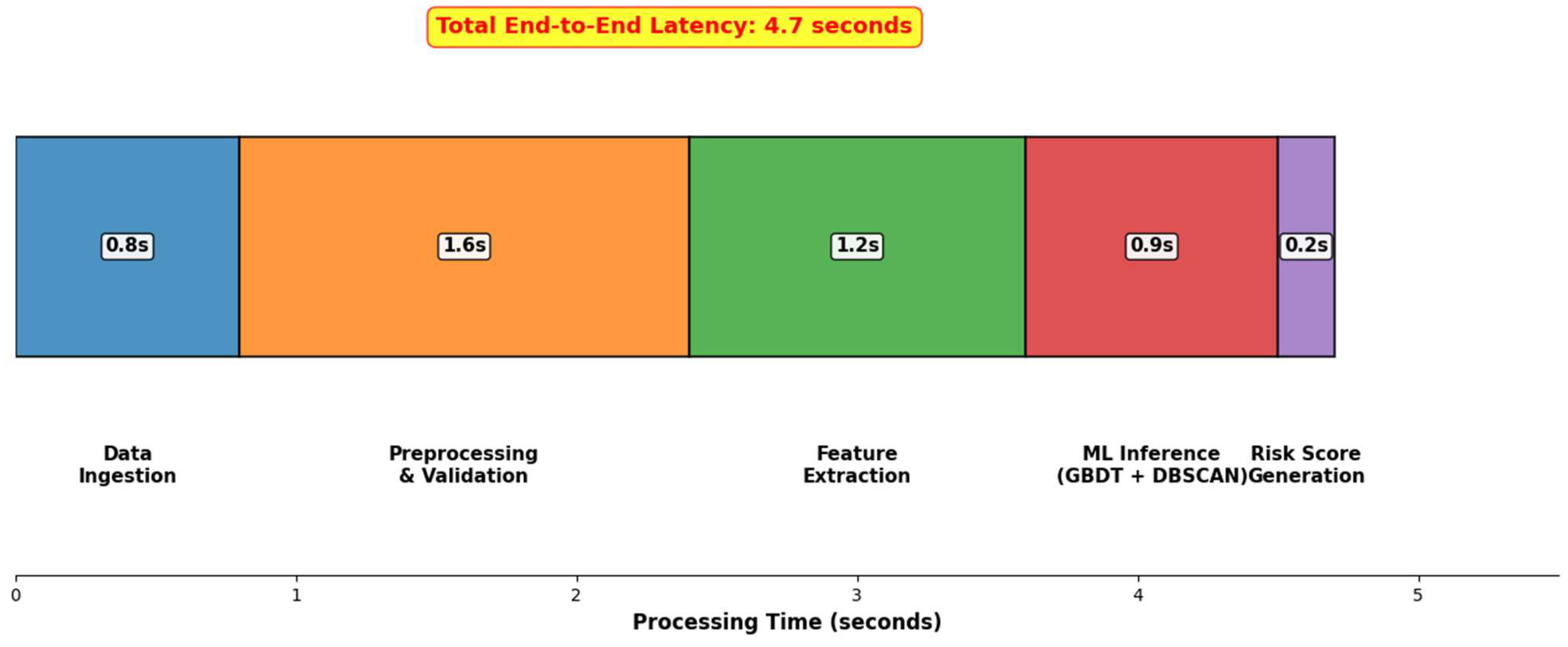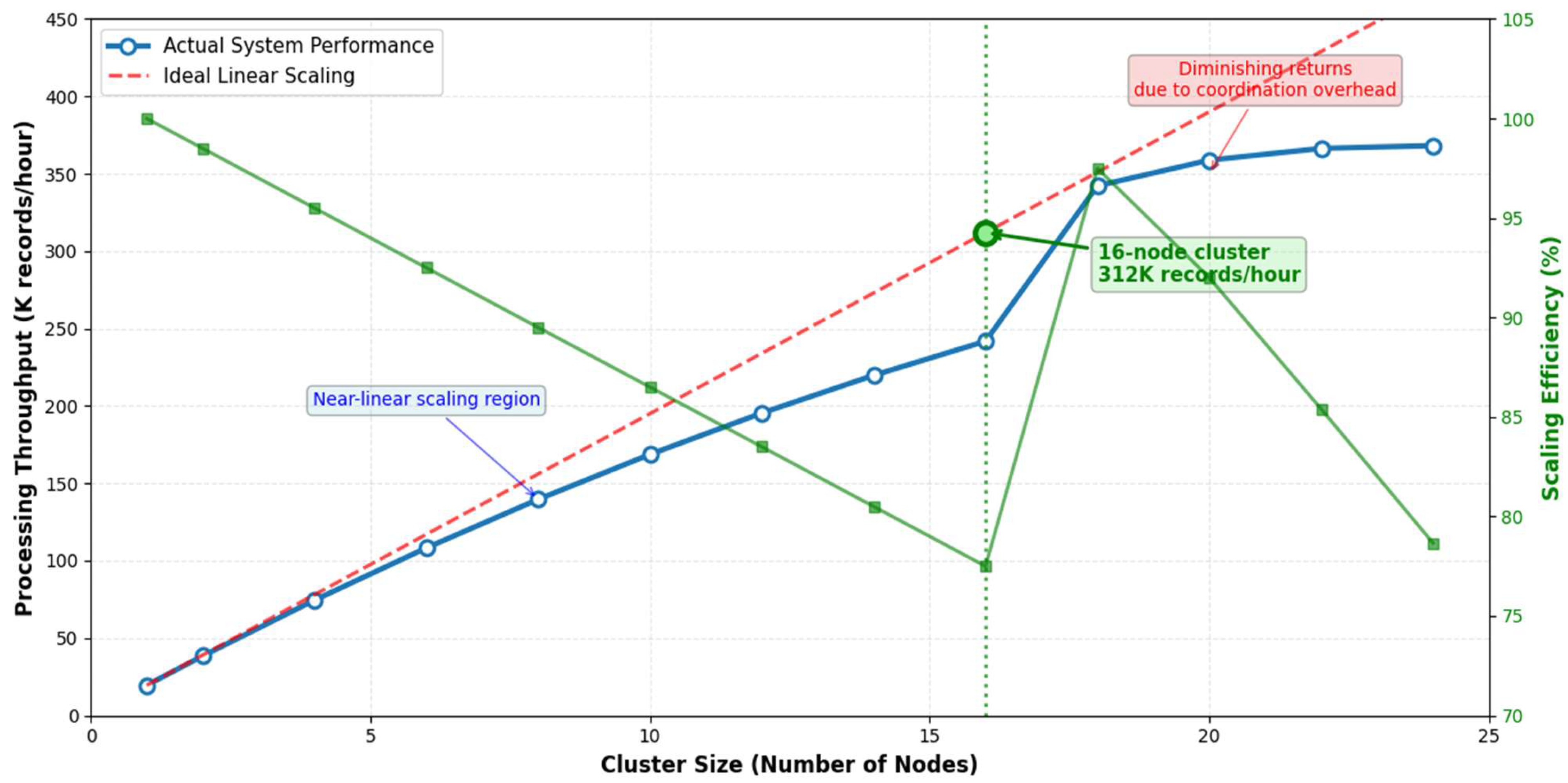 The experimental validation demonstrated compelling performance metrics that validate our architectural and algorithmic choices. The framework achieved 93.3% accuracy in risk classification, with particularly strong performance for critical assets where precision matters the most. The system reduced manual analyst workload by 50–58% compared to existing approaches, enabling organizations to monitor 15–25 entities per analyst per week versus 1–2 with traditional methods. Processing capabilities exceeded 312,000 records per hour on a 16-node cluster, demonstrating scalability to millions of records while maintaining stable performance characteristics. These results confirm that the integration of distributed processing architectures [