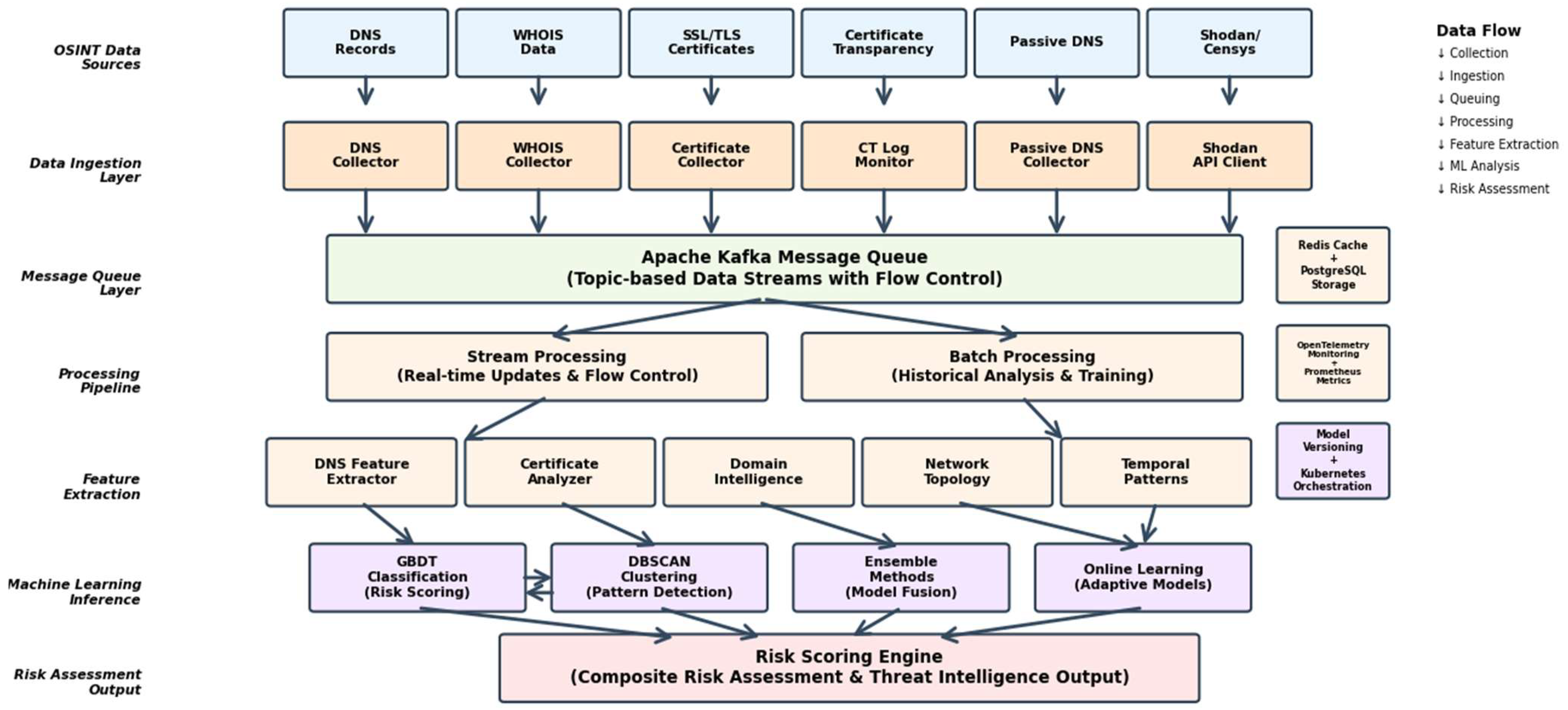 Feature engineering represents a critical factor in the successful application of machine learning to OSINT data. Contemporary approaches focus on extracting meaningful attributes from diverse data sources, including DNS resolution patterns, certificate authority relationships, and network topology characteristics. Antonakakis et al. demonstrated the effectiveness of DNS-based feature extraction for identifying algorithmically generated domains, highlighting the value of temporal and linguistic features in threat detection [