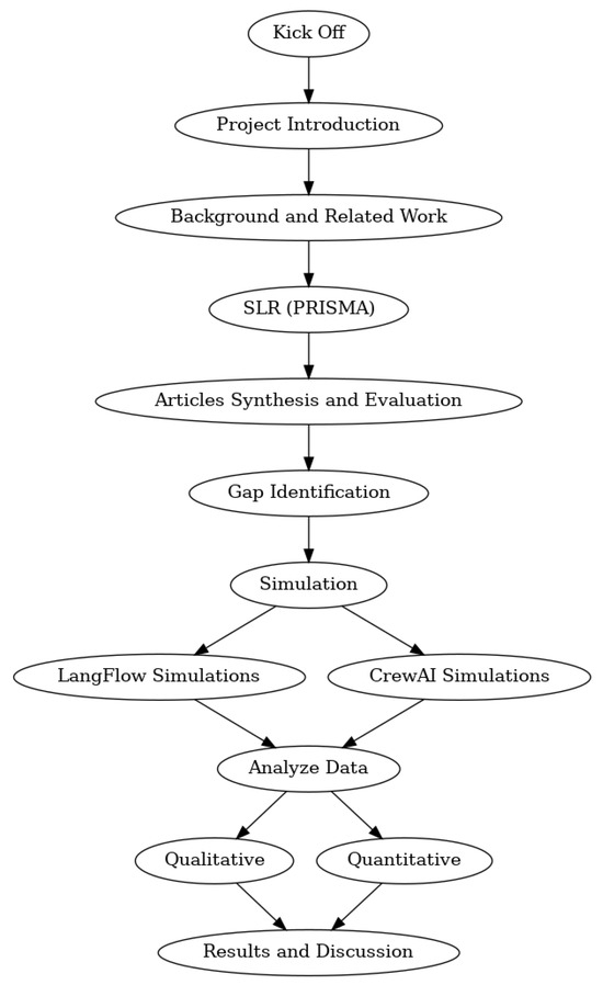 Figure 1 presents the progressive workflow followed in this study, emphasizing the connection between the Systematic Literature Review (SLR) and the simulation based evaluation. The process began with the Kickoff and Project Introduction where we have established the primary research question, reviewed the background of Agentic AI in industrial automation, highlighted why the study is important, and outlined our two-part approach (literature review and simulations). Followed by establishing the Background and Related Work. The systematic literature review was conducted according to PRISMA guidelines, involved identifying relevant publications, synthesizing their findings, and evaluating them against predefined inclusion and exclusion criteria. From this review, we successfully identified key gaps and major threats in Agentic AI used in industries, this guided our simulation design including attacks, metrics, and framework settings. The simulation phase uses two agentic AI frameworks LangFlow and CrewAI tested under comparable conditions. The outputs of simulation were combined and investigated through qualitative and quantitative analyses. Finally, results from both analyses were integrated in the Results and Discussion section, enabling comparisons with the literature review findings and drawing conclusions on performance, resilience, and applicability.