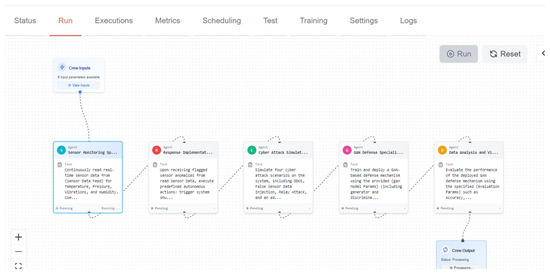 CrewAI framework was selected due to its flexibility in developing complex multi agent systems capable of achieving complex goals. CrewAI is an open source framework designed to coordinate AI agents with role playing and autonomous operations, facilitating cooperation among agents to solve complex problems [61]. In CrewAI, an agent is essentially an intelligent unit designed to perform specific tasks without human intervention. Agents operate autonomously, where they can make decisions and execute actions based on their given instructions. The framework allows for what are called “role customized agents,” which means that each agent can have a unique role or function depending on the needs of the application. The authors note that CrewAI allows developers to define AI agents with specific roles, objectives, and tools. CrewAI is known for its non code graphical interface, which allows non programmers to design and manage MAS effectively [62]. The platform provided an interface to create multi agent workflows through the use of large language models (LLMs), sensor simulation, and real-time anomaly detection.