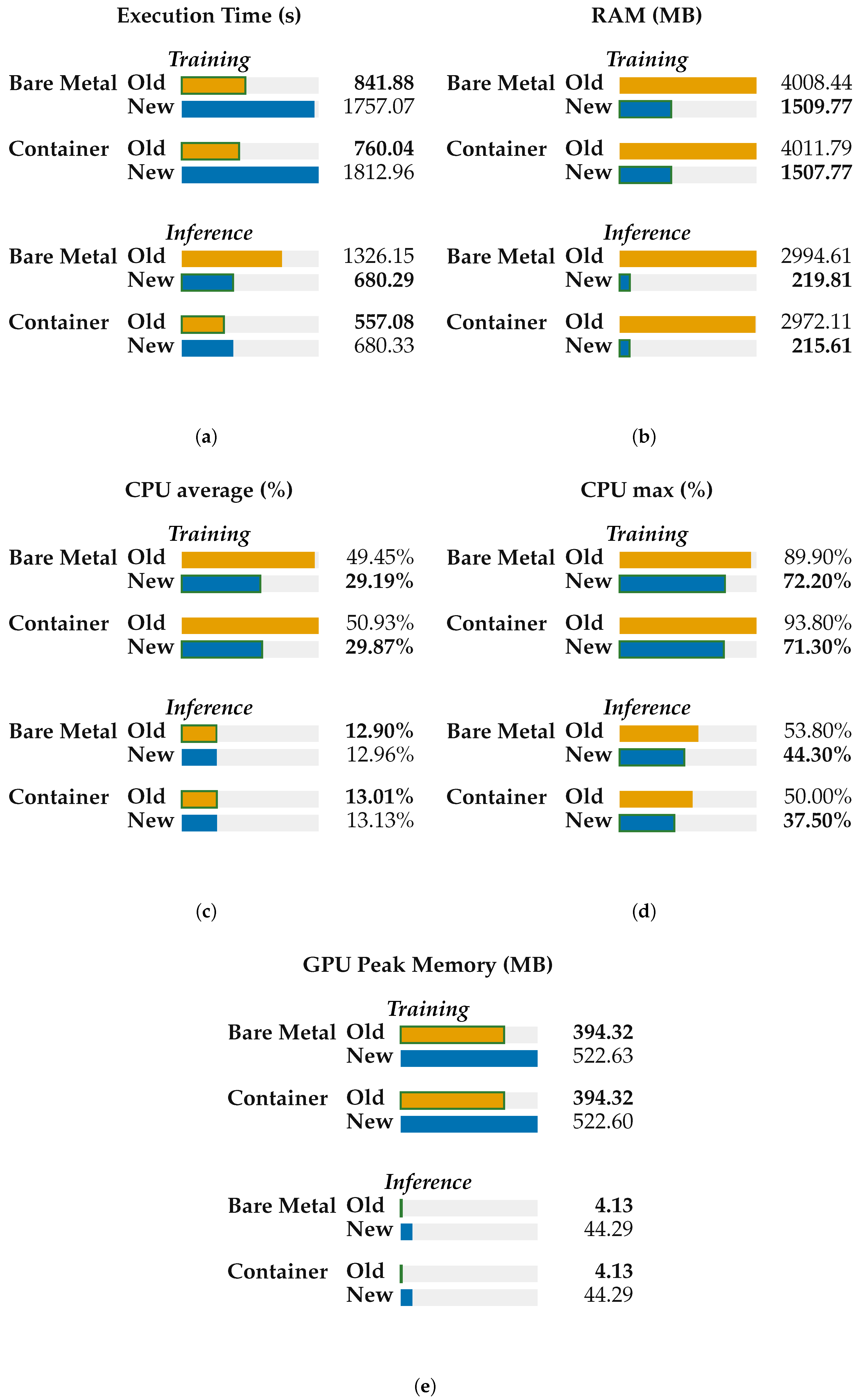 - Resource utilization across deployments. At a fixed framework version, containers and bare metal show near-identical resource profiles.