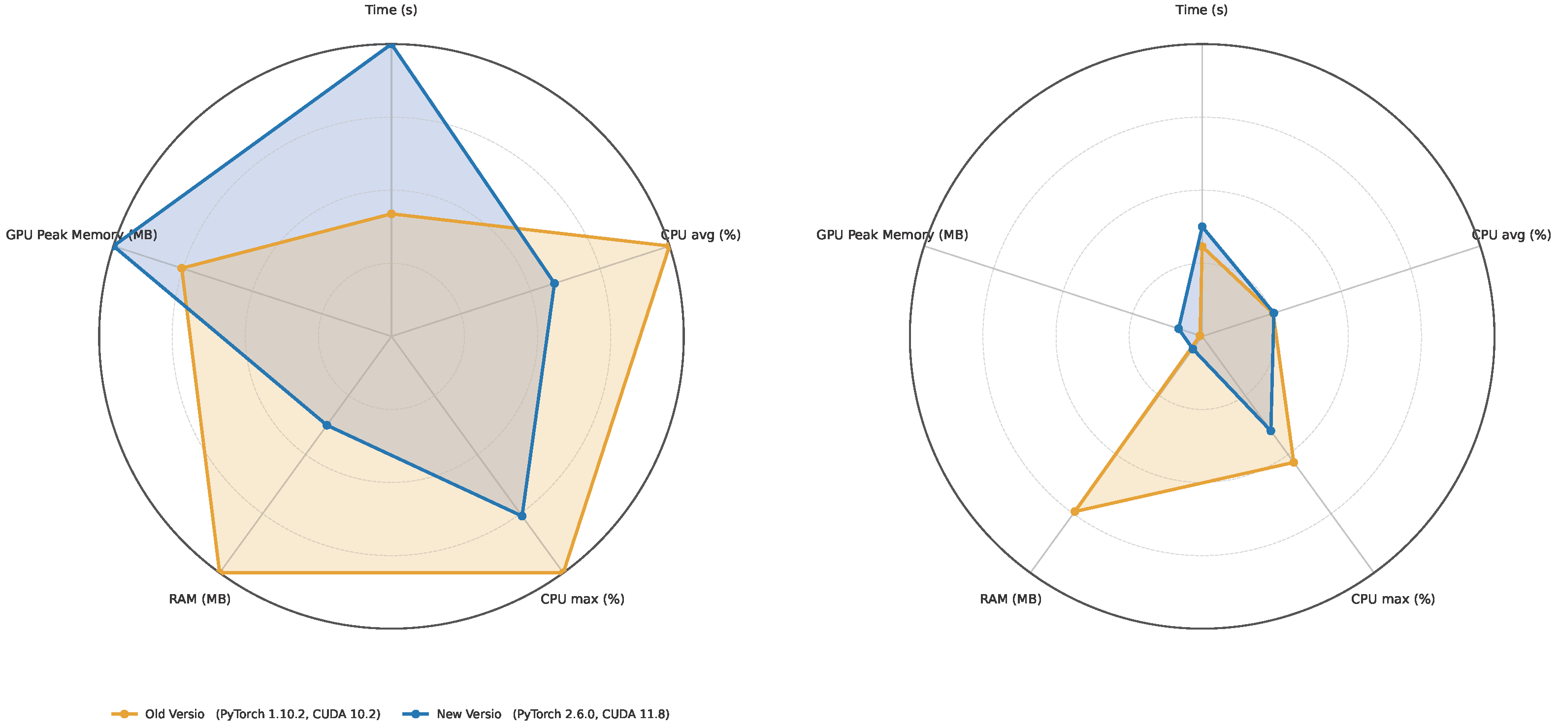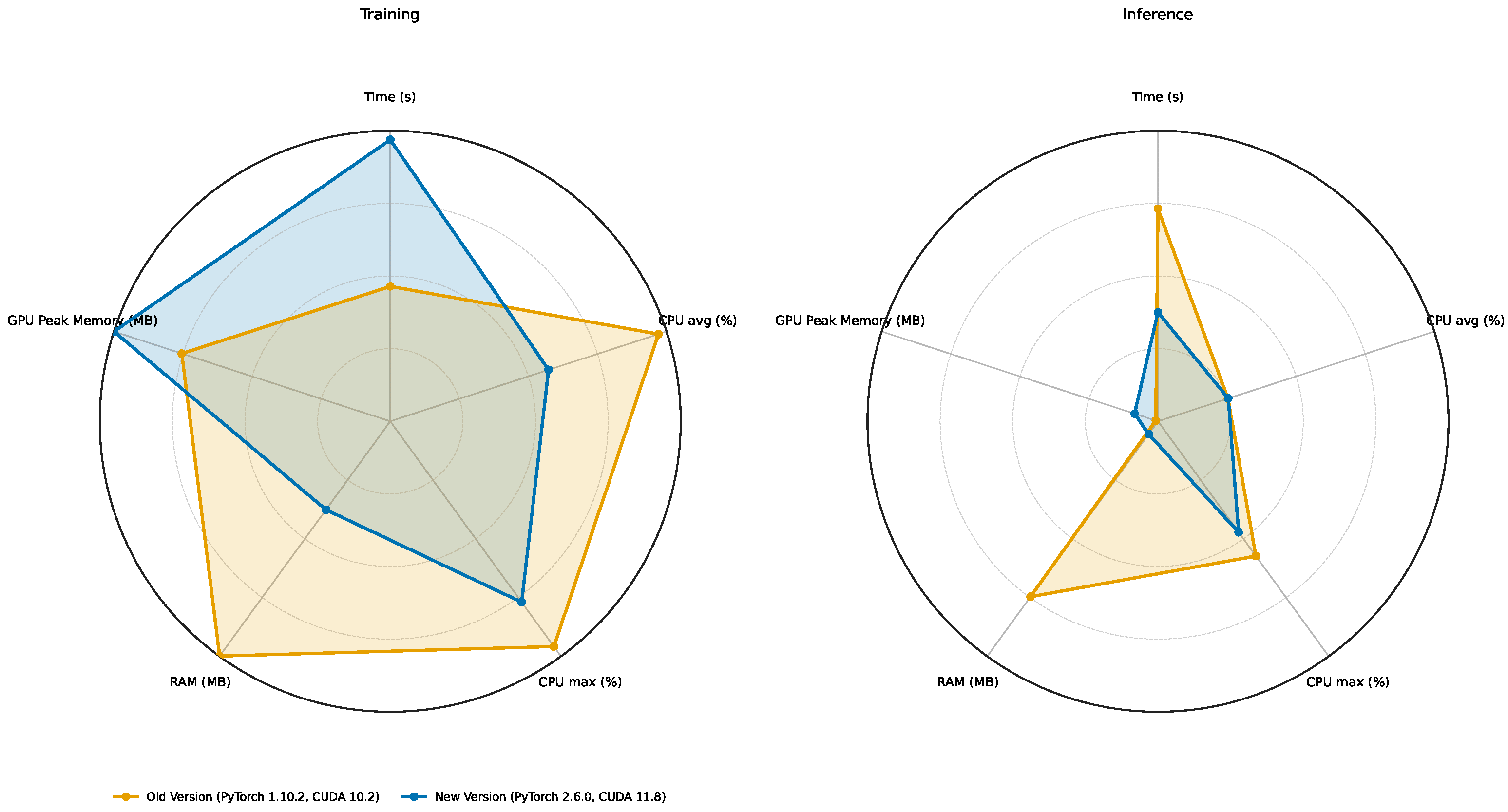 - GPU peak memory: In a fixed version, container and bare metal are effectively identical. Across versions, 2.6.0 increases peak GPU memory (training: ∼+33%; inference: ∼10.7×), independent of deployment.
