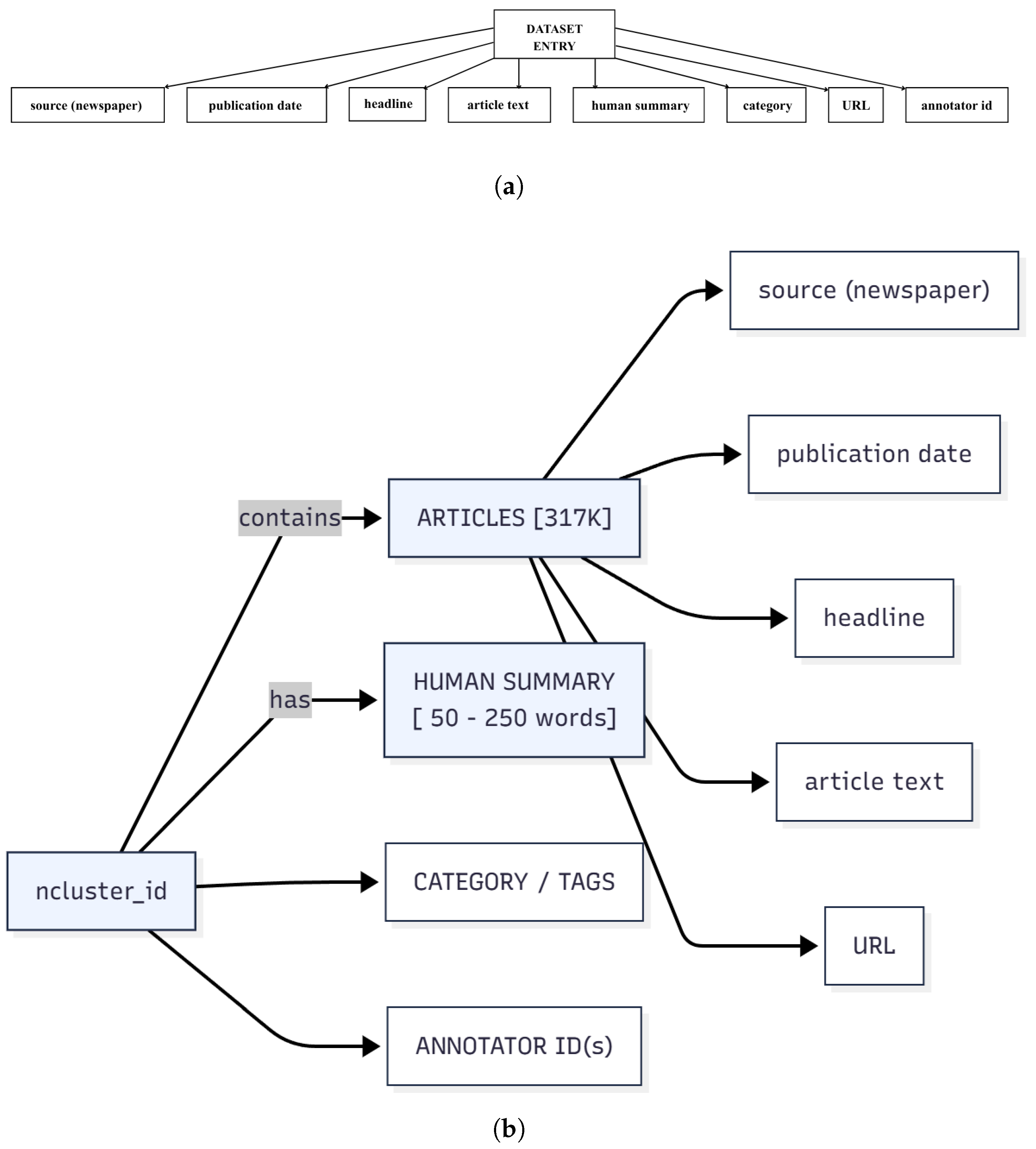 | Dataset | Articles/Clusters | Human | Multi | Years | Cats. | Domain | Accessibility |