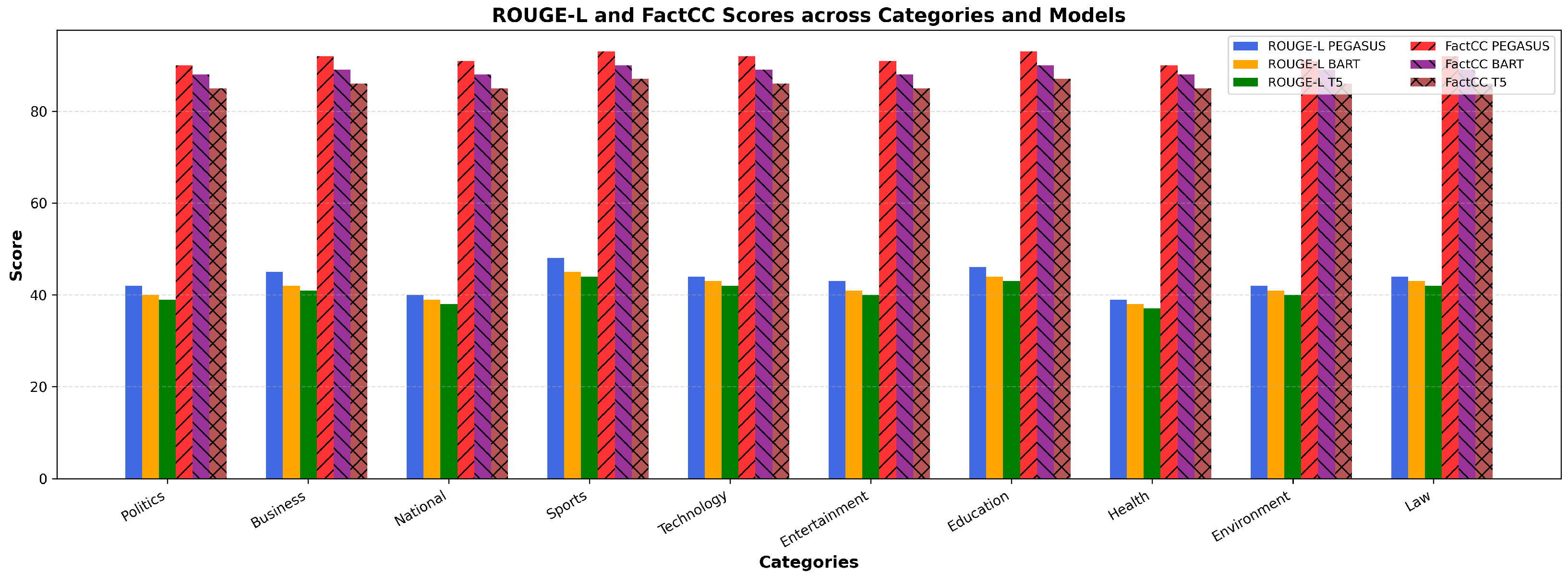 | Category | PEG ROUGE-L | PEG FactCC | BART ROUGE-L | BART FactCC | T5 ROUGE-L | T5 FactCC |