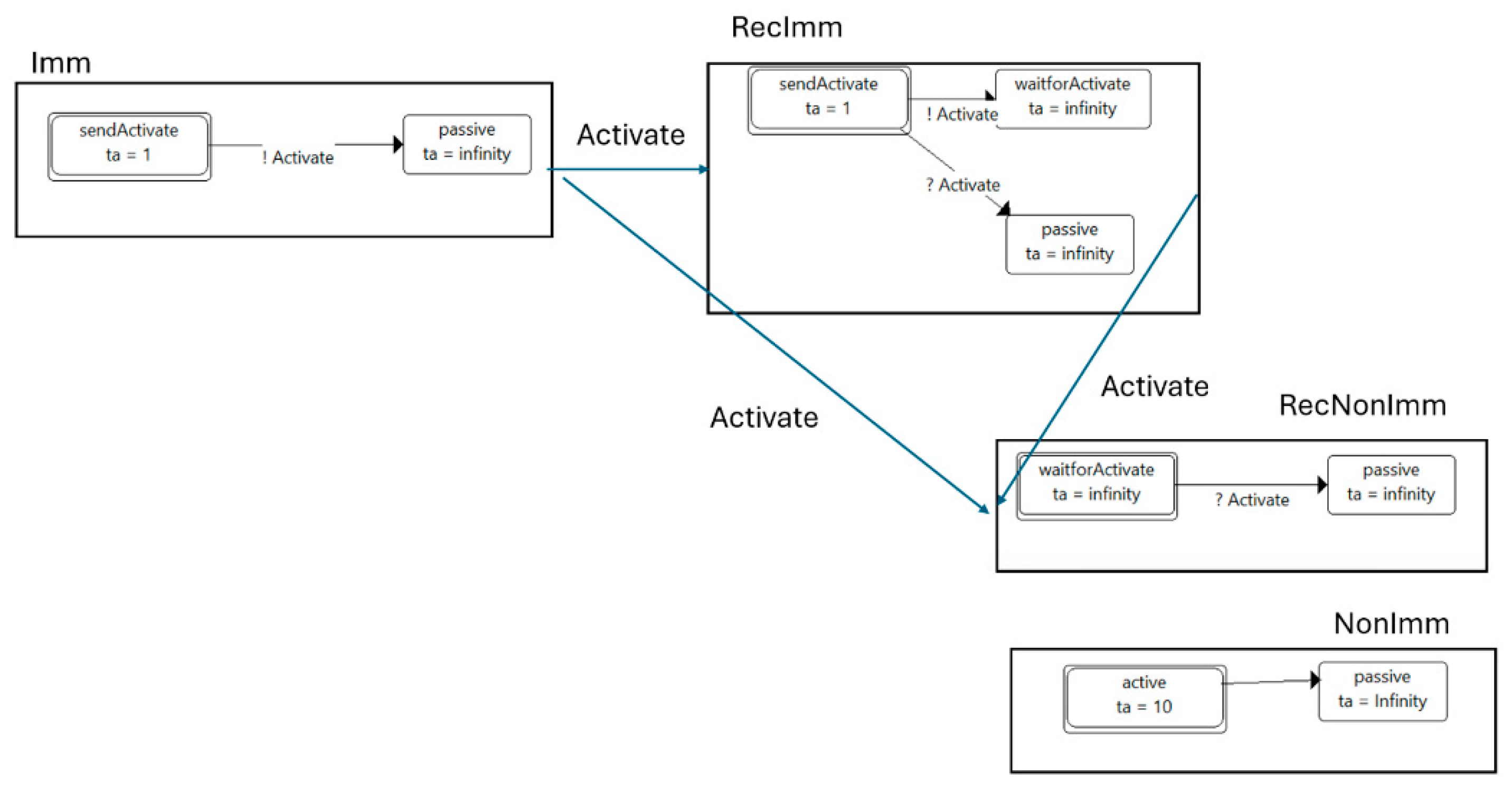 - Since RecImm is imminent and receives an input, it uses its confluent function to compute its next state as waitForActivate (here the confluent function computes the external transition before the internal transition)