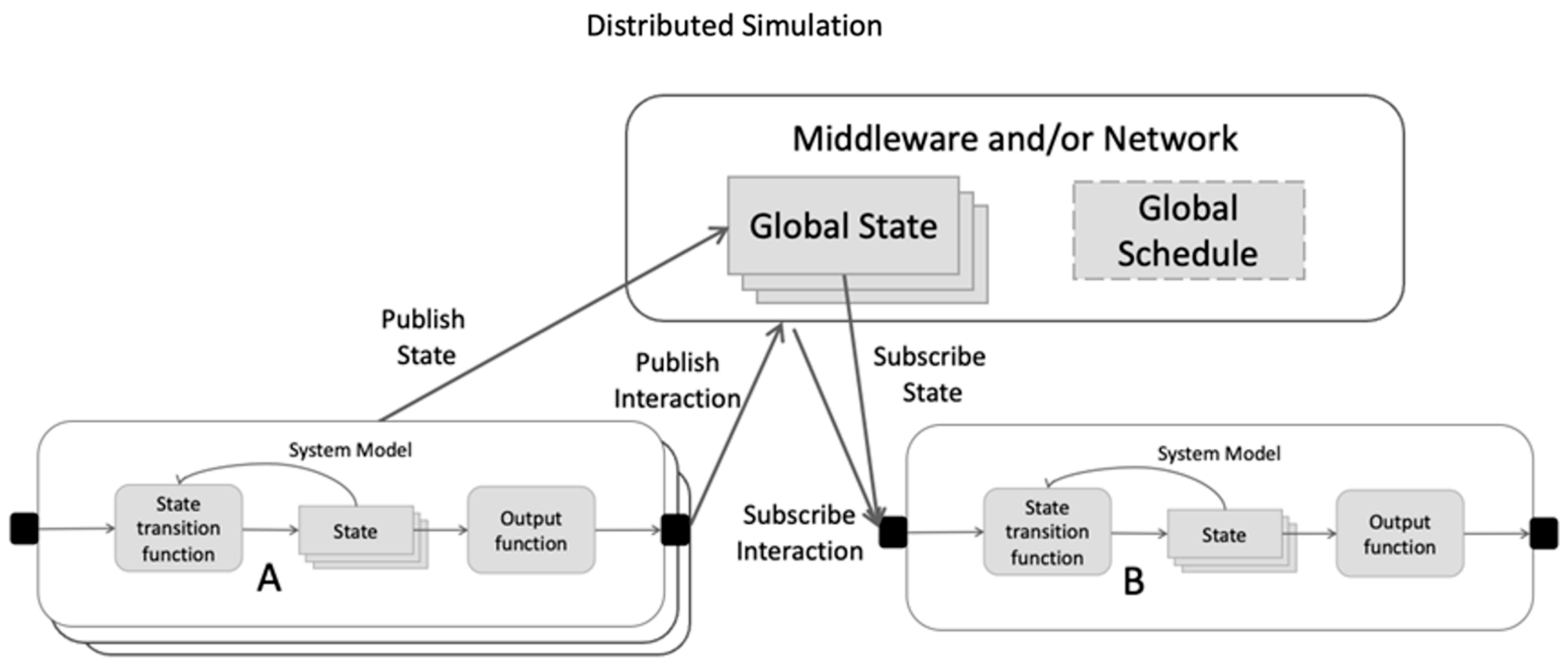 - Generalizing co-simulation frameworks to hybrid systems, reexamining the general concept without reference to FMIs. A DEVS simulator can execute in synchrony with an HLA federation where each can share global state variable data with the other. Problems not yet mentioned are the quantized state representation of continuous trajectories [134,135,136,137,138,139,140,141,142,143,144,145] and the location of state events [146] in coupling of hybrid component. Camus [59] presents a co-simulation framework employing the universality of DEV&DESS and its formally defined approach to locating state events in differential equation components attaining the capability to modify event-detection functions and to handle discrete internal transitions. The Heterogeneous Flow System Specification [26,147] provides a more general approach that is not fully integrated within DEVS, limiting its effectiveness. Research is needed to identify modes of global state sharing that are effective and efficient where non-modular models possibly expressed in different formalisms are involved as they are in hybrid systems.